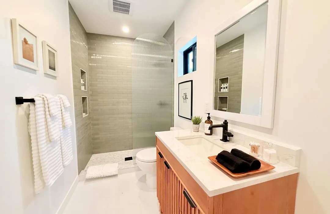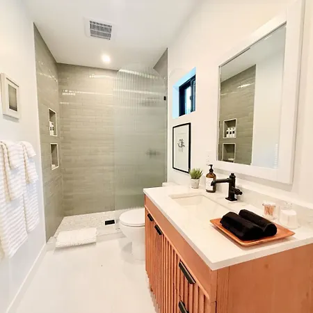 A pousada Modern Ojai 1Br Suite Near Town dispõe de casa de banho com máquina de lavar e chuveiro.
